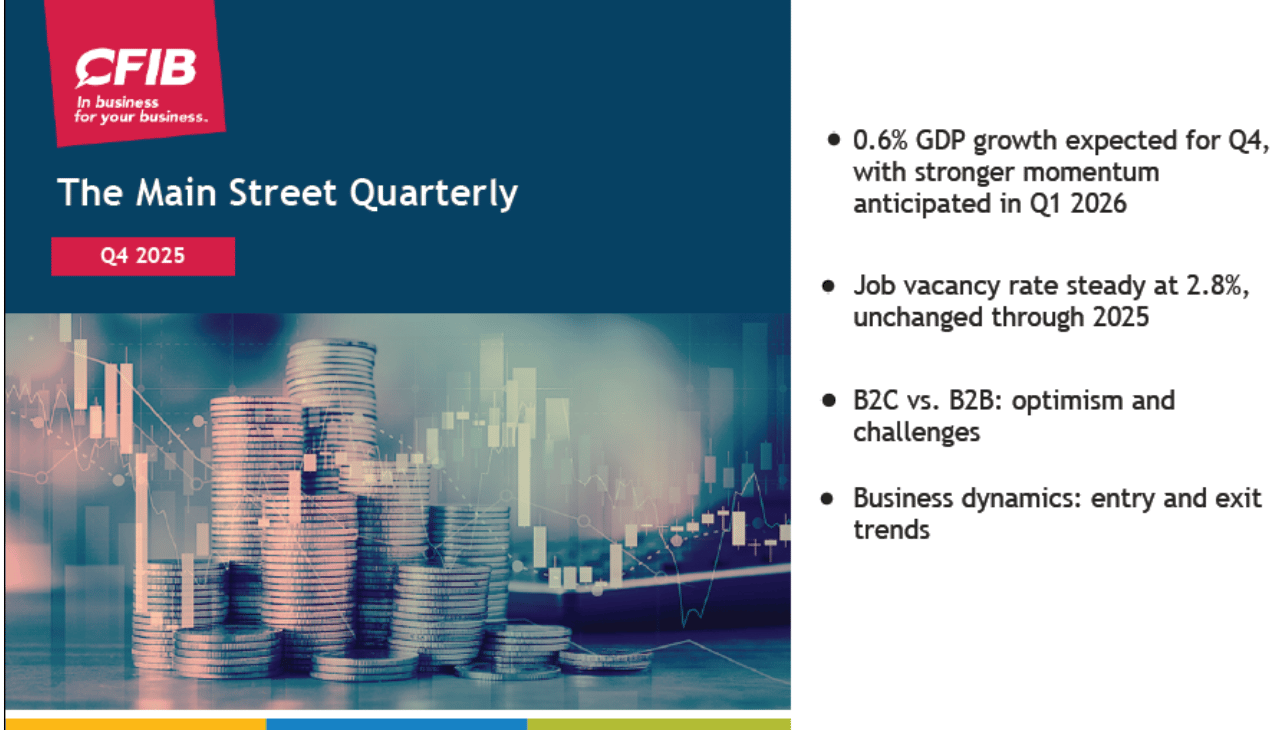 The Main Street Quarterly also contains CFIB’s latest estimates of private sector job vacancies and an interactive page. The ‘In Focus’ section, which covers a specific topic each quarter, focuses currently on the B2C versus B2B firms. This edition analyses business entry and exit trends for 2015 to 2025 by sector.
